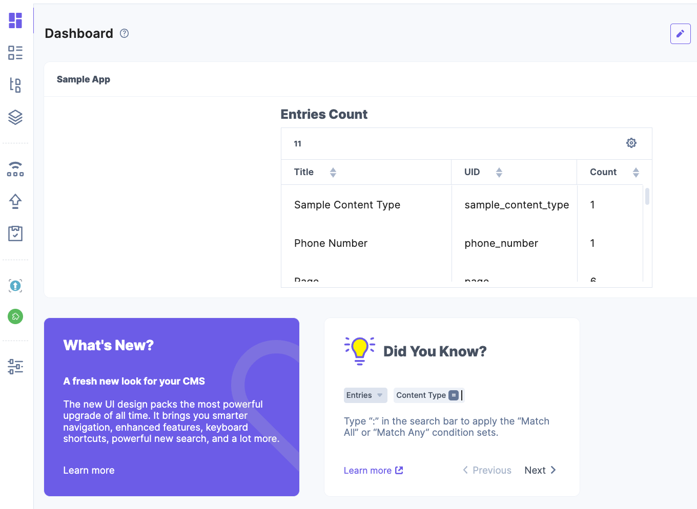 In this exercise you will get the list of content types in Contenstack and you will display the amount of entries created based on each of those content types. The idea here is to illustrate how you can leverage the sdk to access other modules of the system, in this case, content types.
