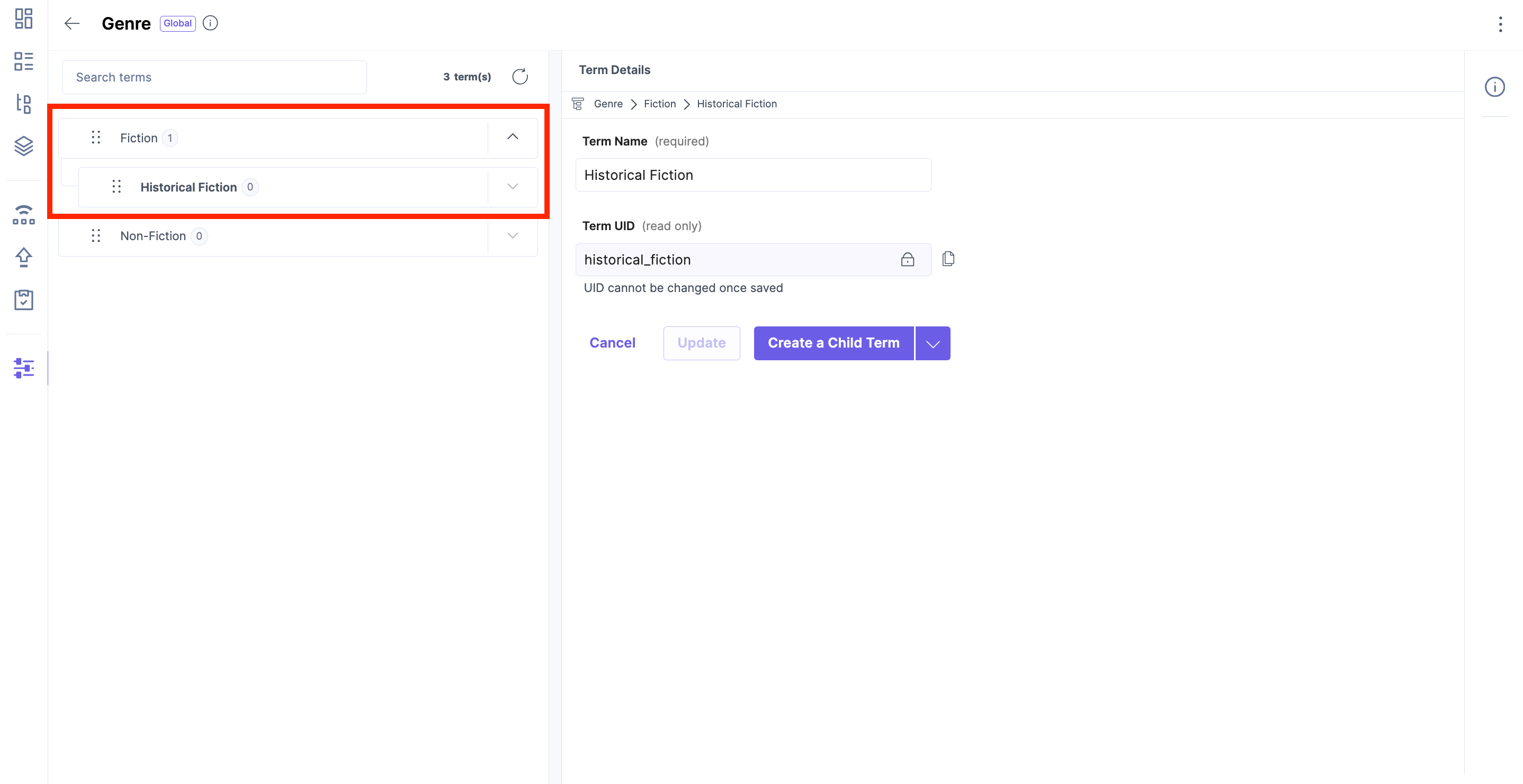 This takes you to the "Term Details" page. Enter the Term Name and Term UID and click the "Save" button. Here, we are creating a new child term, "Historical Fiction." The following shows the term " Historical Fiction" being created under the "Genre" taxonomy.